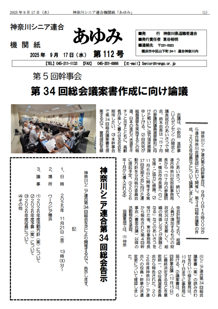 2025年9月24日 最終更新日時 : 2025年9月24日 admin_jtm カテゴリー神奈川シニア連合 神奈川シニア連合機関紙「あゆみ」第112号(2025.9) 神奈川シニア連合機関紙「あゆみ」第112号(2025.9)