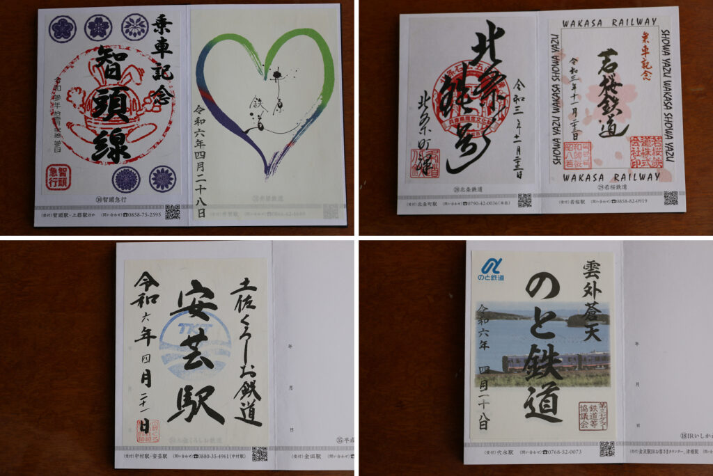 井原鉄道、土佐くろしお鉄道、のと鉄道(能登地震で不通になったため他の鉄道が支援のため、のと鉄道の「鉄印」を販売した)の8鉄道です。次は、まさに「灯台下暗し」で未だ乗っていない地元徳島県の阿佐海岸鉄道の「鉄印」をゲットしに行く予定です。